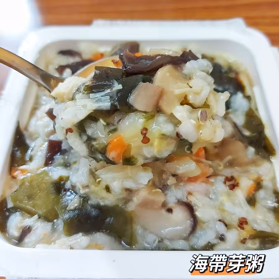 #海帶芽粥 海帶芽在日本人稱為「長壽菜」,富含有高含量的營養價值,擁有維生素A、維生素B1、B2、B6、B12、維生素C、維生素E、泛酸、葉酸等多種人體所需的營養,尤其鈣、鐵、碘等礦物質含量非常豐富。味道吃起來順口又不膩,滿滿的料一餐就很有飽足感!